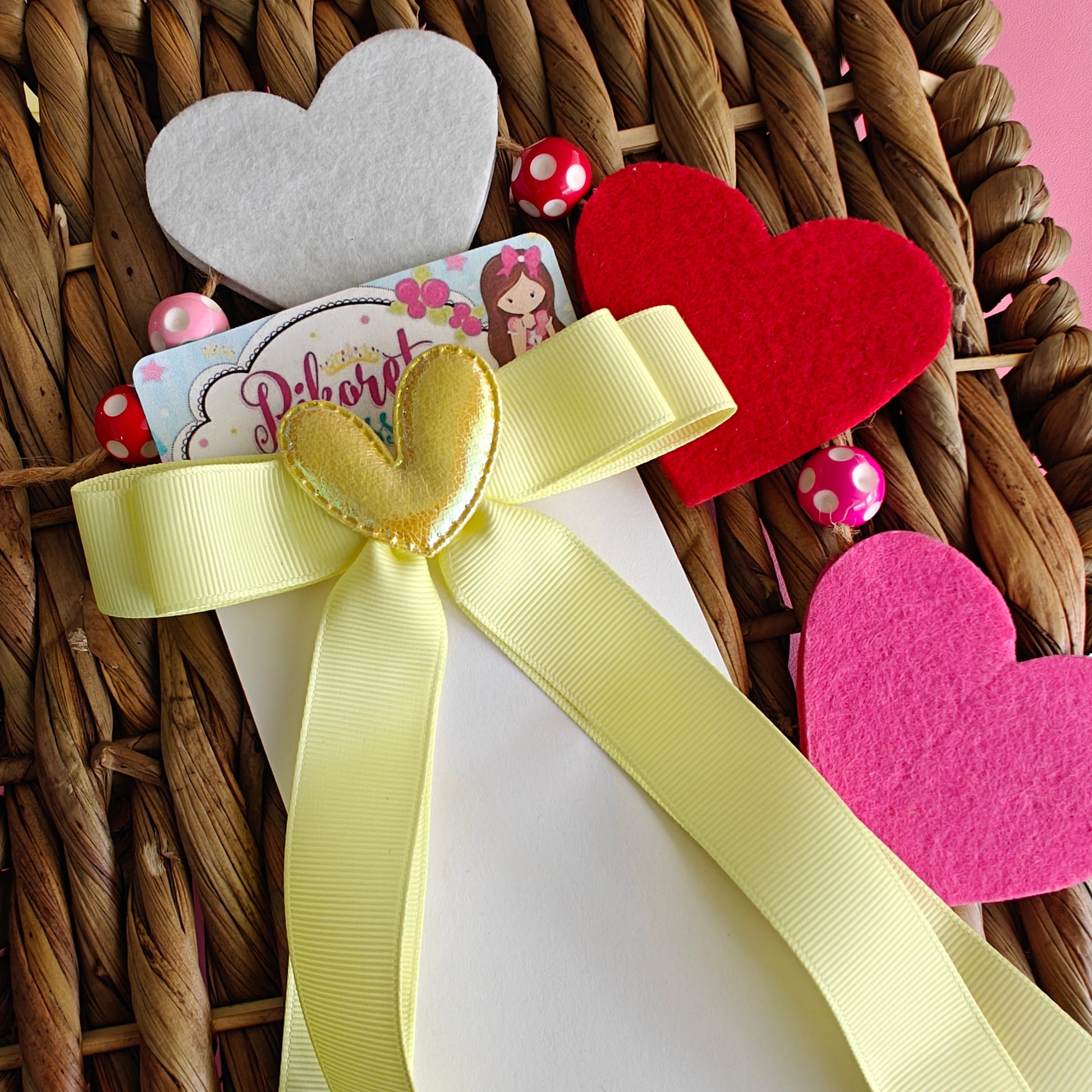 Delicada pieza en cinta color amarillo con centro de corazón. Colocada en alligator clip mediano.