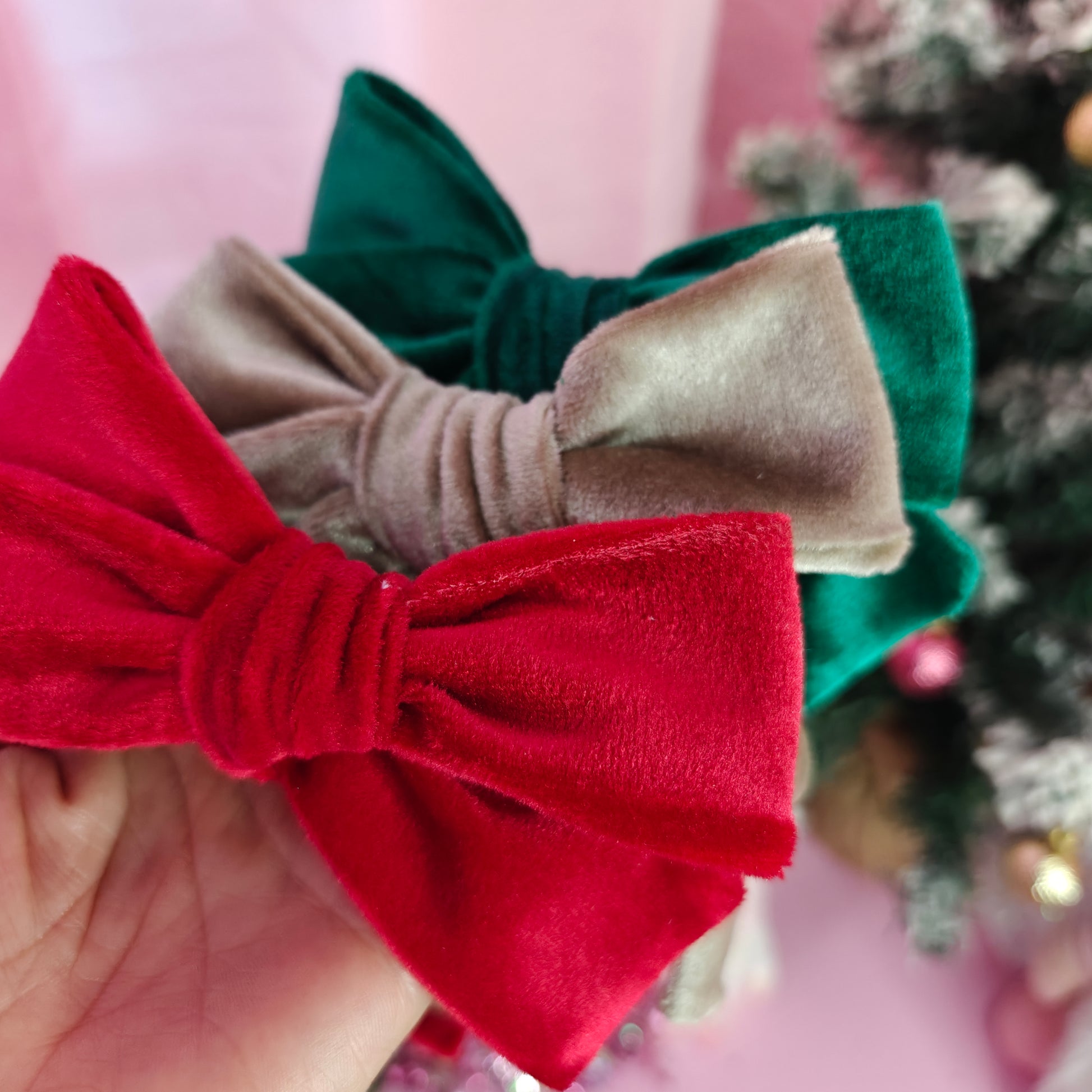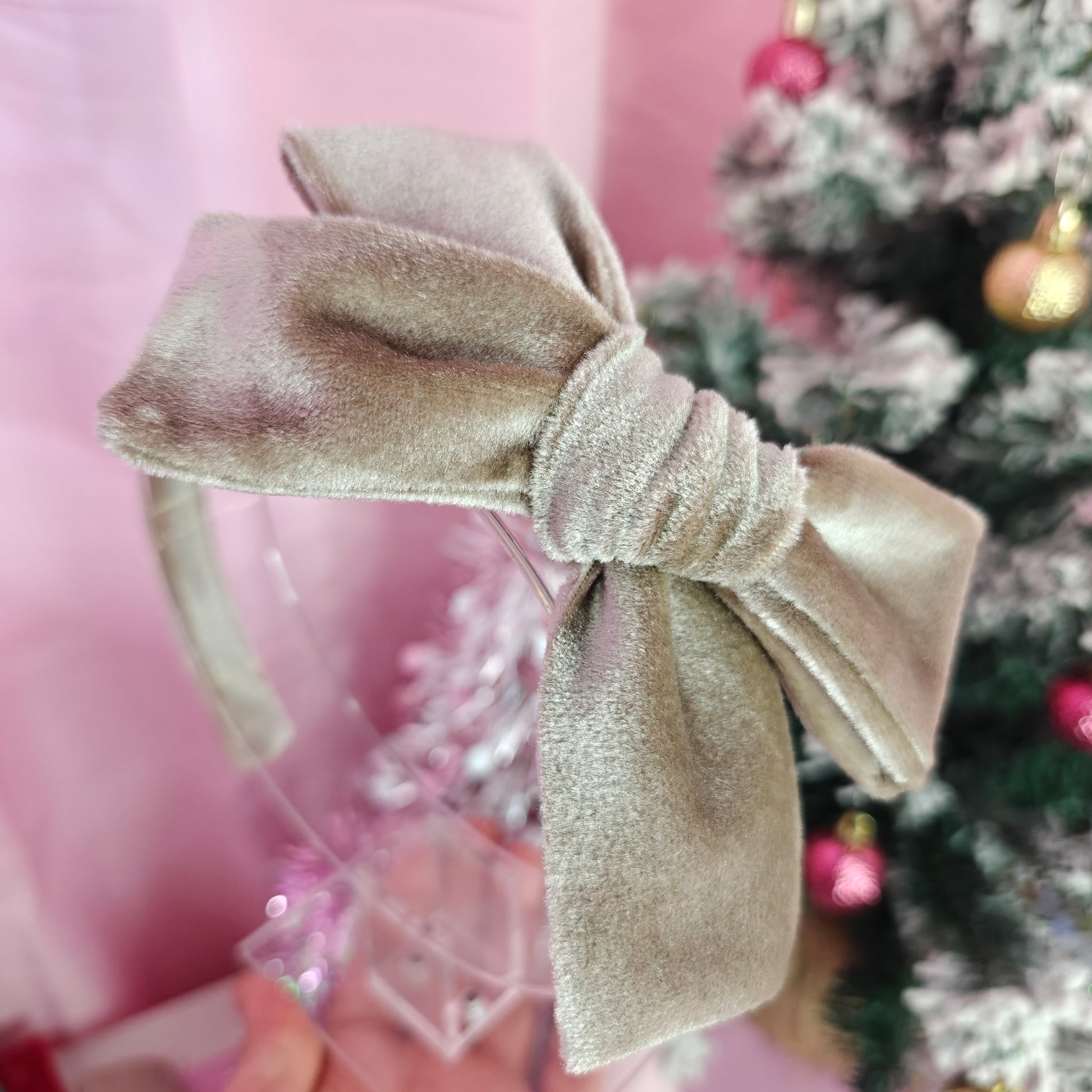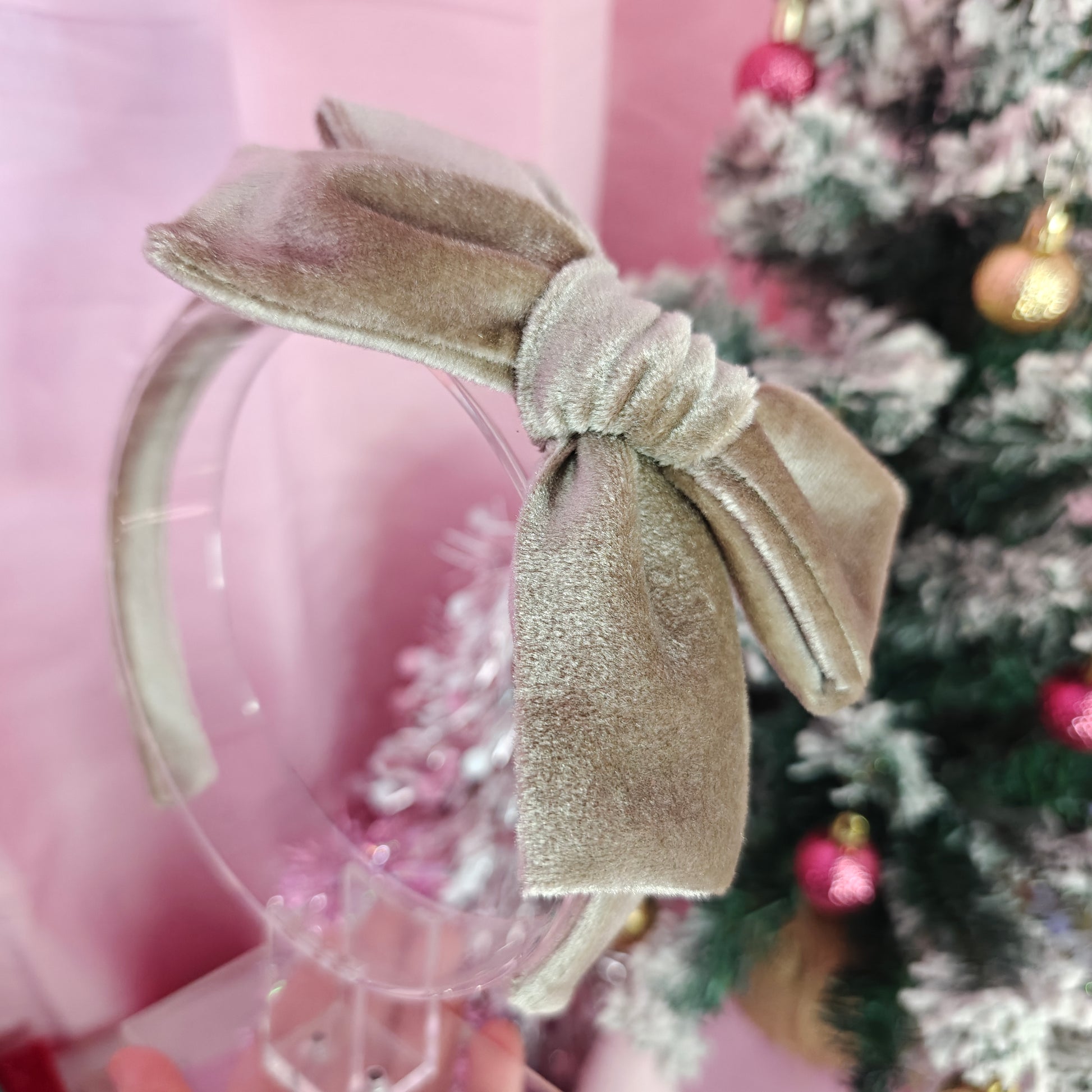 Delicada diadema forrada con tela terciopelo de textura suave. Ideal para completar outfits de temporada navideña por su aspecto lujoso.